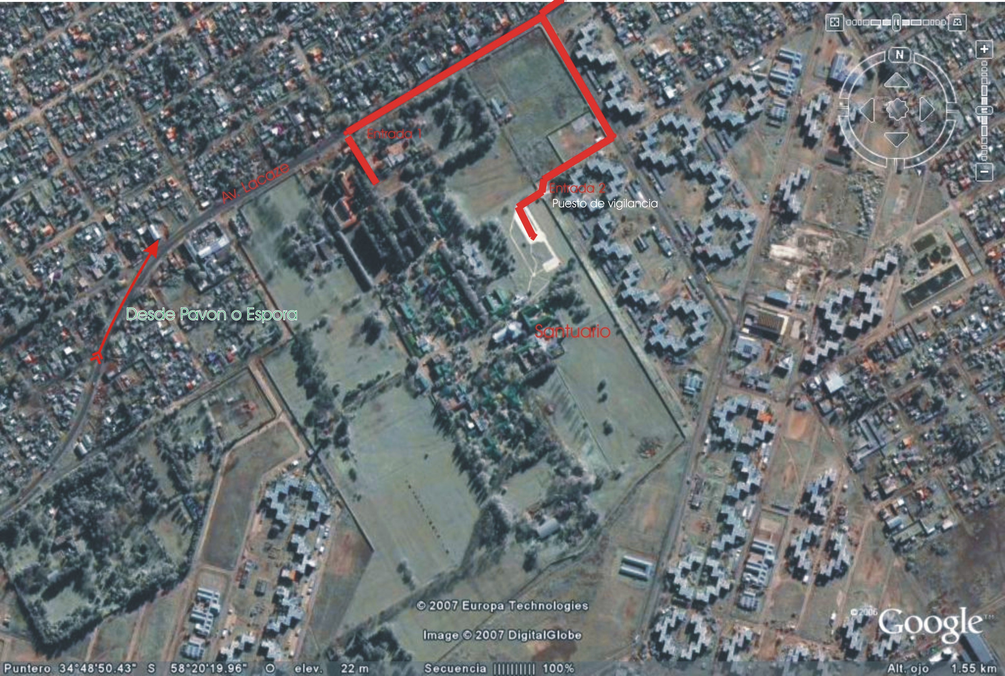 Es recomendable ingresar por la puerta lateral (entrada 2, en la cual se encuentra un playon con buenas dimensiones como para estacionar los vehiculos, sin inconvenientes). Si vienen desde el lado de Av. Pavon o en tal caso Av. Espora, deberan cruzar por frente a la entrada del Cottolengo Don Orione (Av. Lacaze 3963) continuar hasta la esquina (es un trayencto de unos 300mts.) y girar a la derecha, continuar bordeando el paredon que rodea al Cottolengo y doblar a la derecha en la primer calle que se encuentre, se sigue por ella unos 100 mts. en donde hay una subida hacia la puerta de entrada lateral del Cottolengo, anunciarse con la gente de seguridad e ingresar, estacionar los vehiculos en el predio y continuar caminando unos metros hasta llegar al costado del Santurio. |